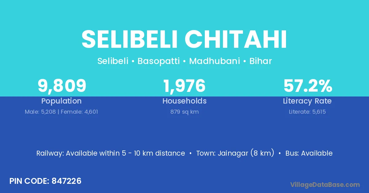Jainagar (8 km) is the nearest town to Selibeli Chitahi village for major economic activities and is located approximately 8 km away.