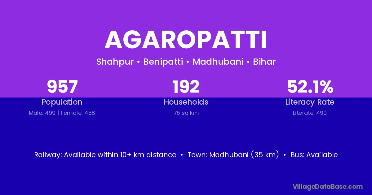 Madhubani (35 km) is the nearest town to Agaropatti village for major economic activities and is located approximately 35 km away.