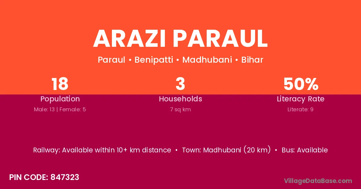Madhubani (20 km) is the nearest town to Arazi Paraul village for major economic activities and is located approximately 20 km away.