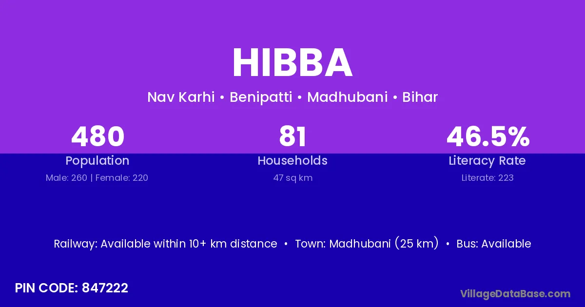 Madhubani (25 km) is the nearest town to Hibba village for major economic activities and is located approximately 25 km away.