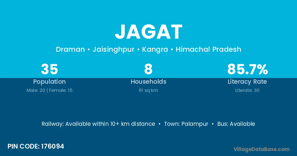 The literacy rate of Jagat village is 53.99%. Male literacy stands at 61.60% and female literacy at 45.23%.