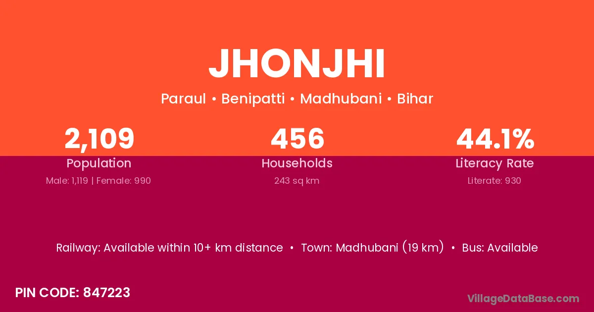 Madhubani (19 km) is the nearest town to Jhonjhi village for major economic activities and is located approximately 19 km away.