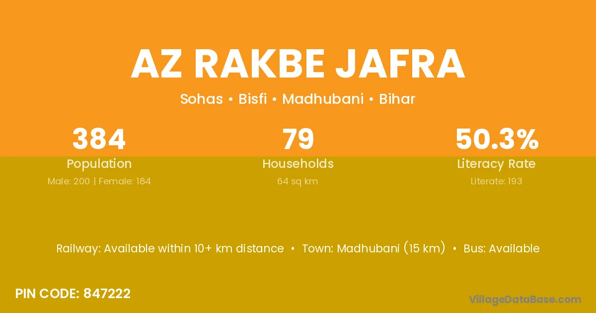 Madhubani (15 km) is the nearest town to Az Rakbe Jafra village for major economic activities and is located approximately 15 km away.