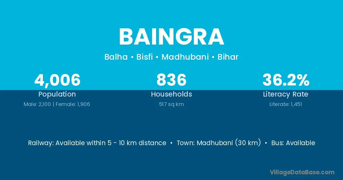 Madhubani (30 km) is the nearest town to Baingra village for major economic activities and is located approximately 30 km away.