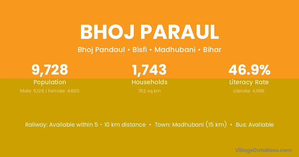 Madhubani (15 km) is the nearest town to Bhoj Paraul village for major economic activities and is located approximately 15 km away.