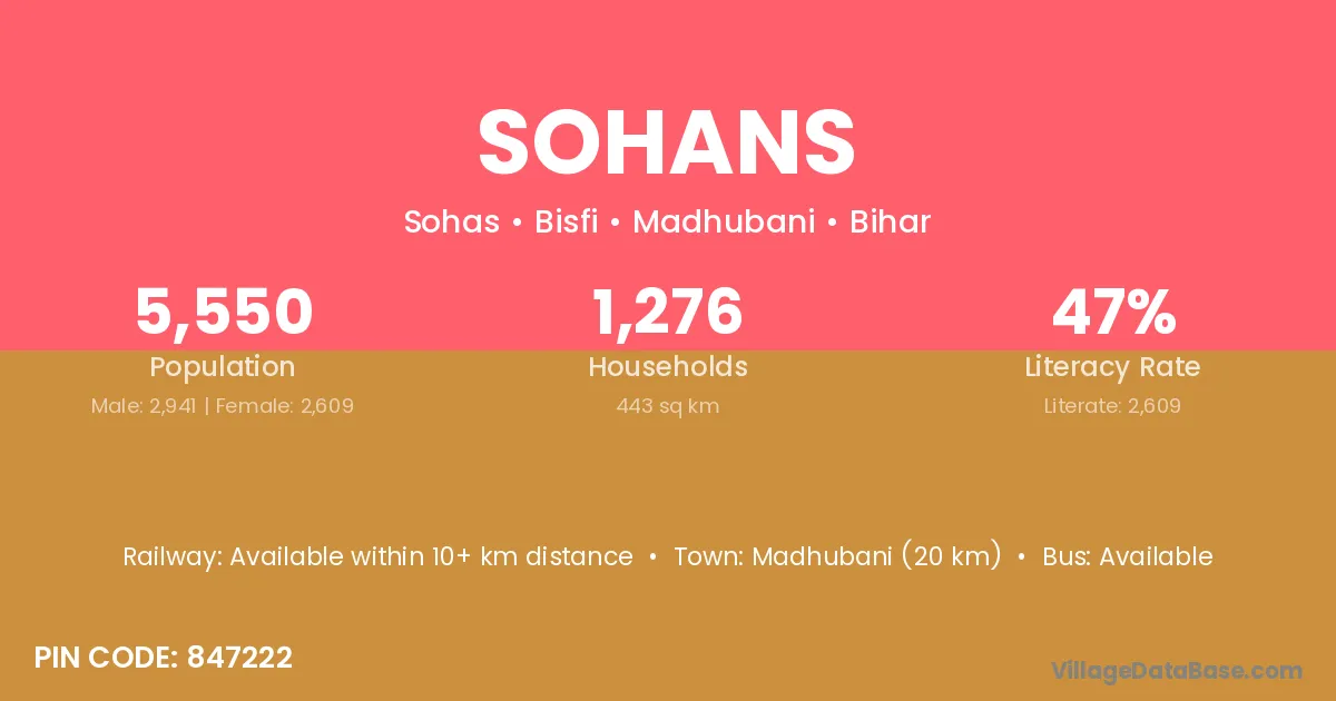 Madhubani (20 km) is the nearest town to Sohans village for major economic activities and is located approximately 20 km away.