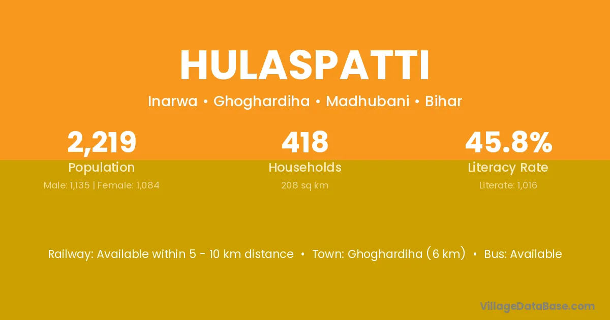 Ghoghardiha (6 km) is the nearest town to Hulaspatti village for major economic activities and is located approximately 6 km away.