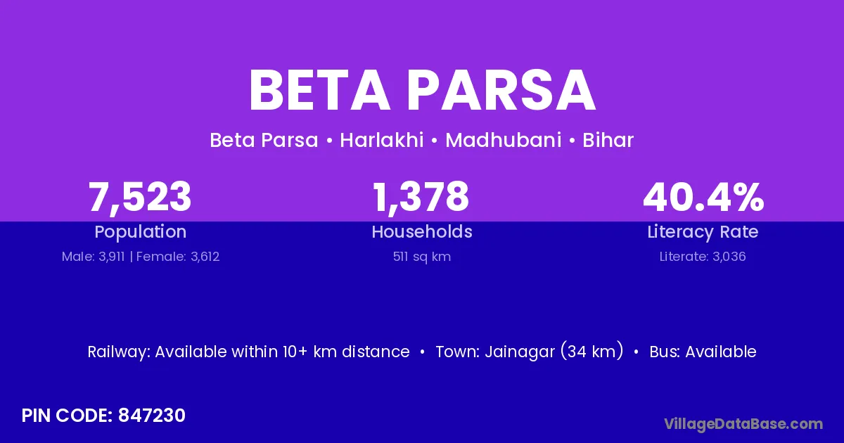 Jainagar (34 km) is the nearest town to Beta Parsa village for major economic activities and is located approximately 34 km away.