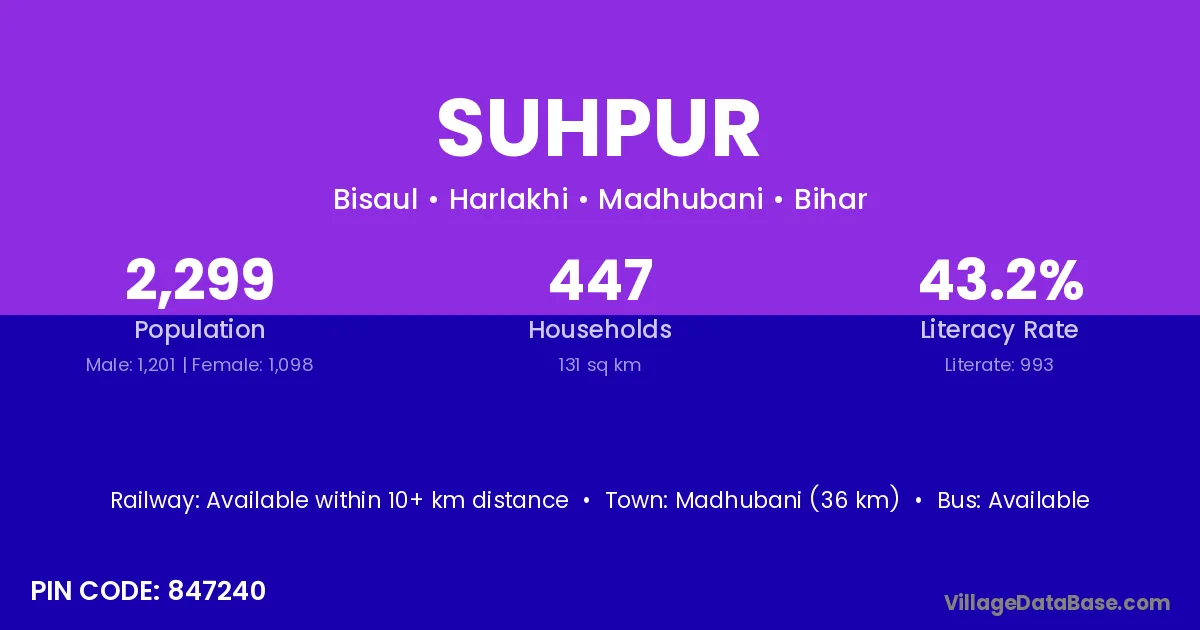 Madhubani (36 km) is the nearest town to Suhpur village for major economic activities and is located approximately 36 km away.