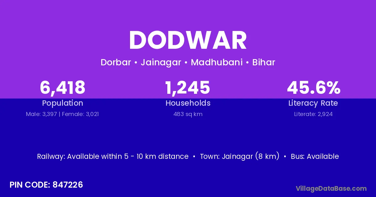 Jainagar (8 km) is the nearest town to Dodwar village for major economic activities and is located approximately 8 km away.