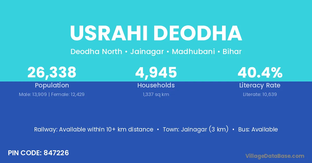 Jainagar (3 km) is the nearest town to Usrahi Deodha village for major economic activities and is located approximately 3 km away.