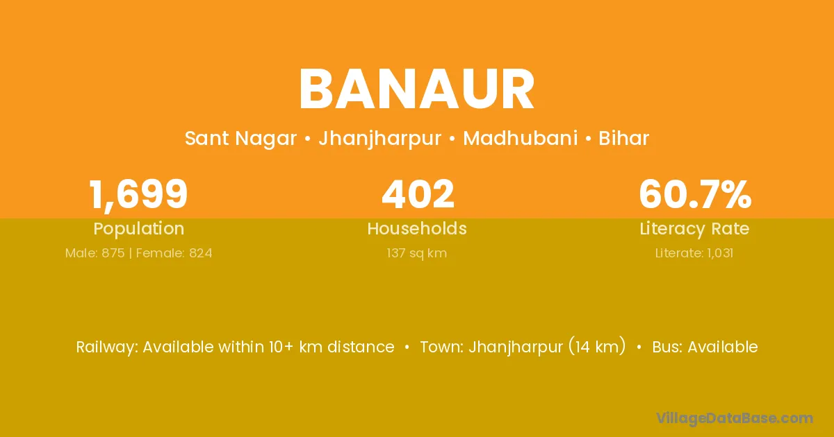 Jhanjharpur (14 km) is the nearest town to Banaur village for major economic activities and is located approximately 14 km away.