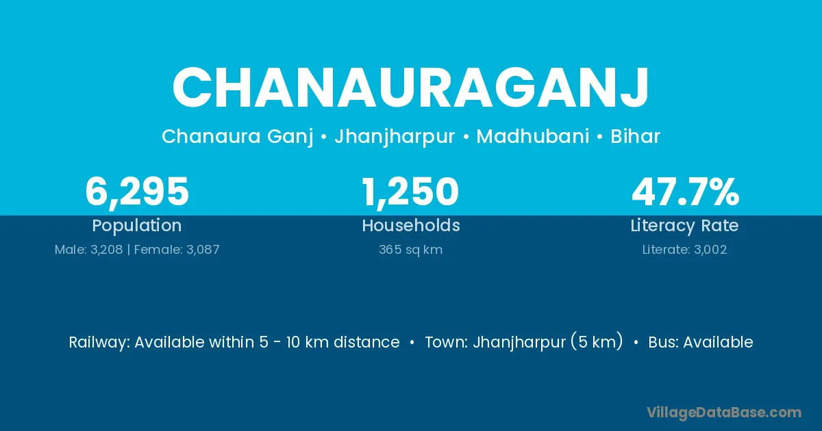 Jhanjharpur (5 km) is the nearest town to Chanauraganj village for major economic activities and is located approximately 5 km away.