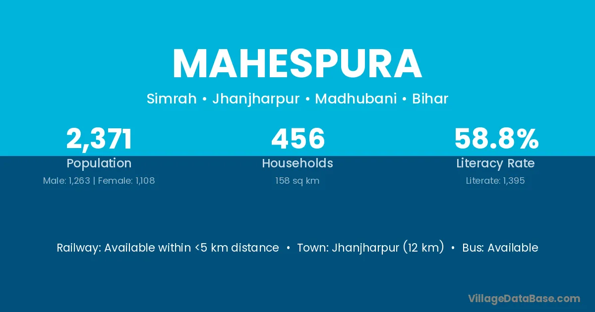 Jhanjharpur (12 km) is the nearest town to Mahespura village for major economic activities and is located approximately 12 km away.