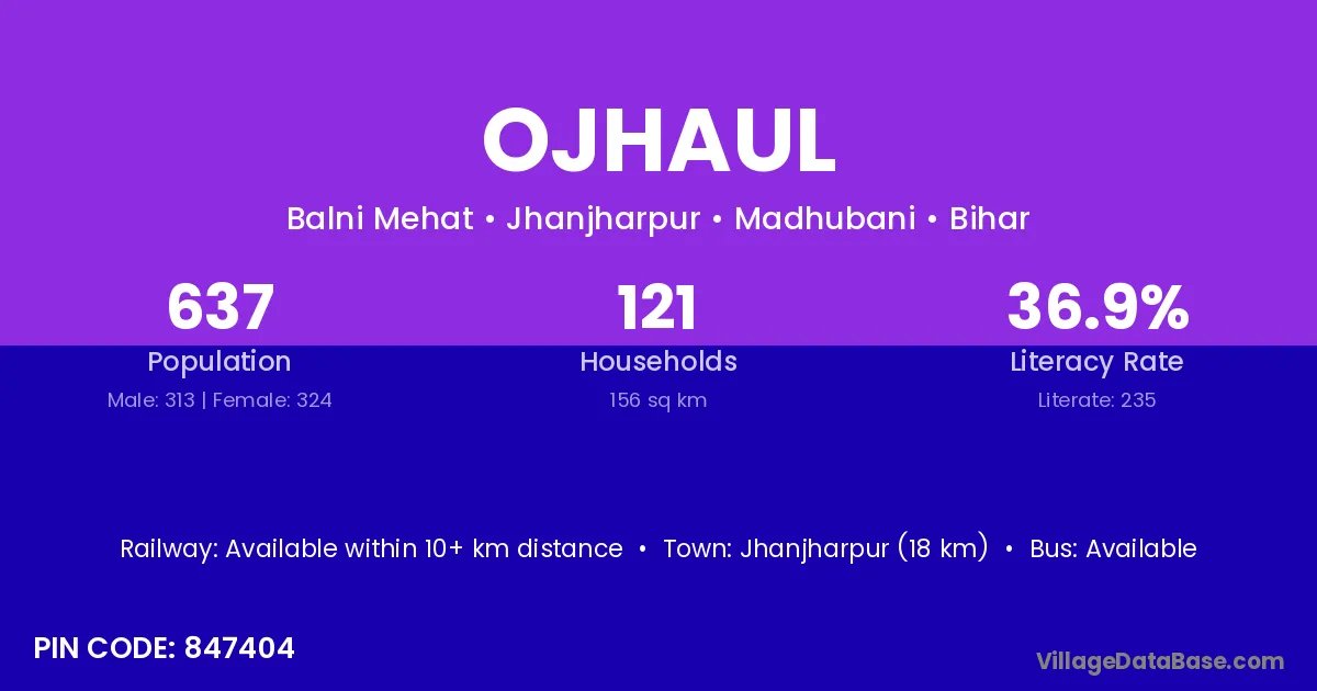 Jhanjharpur (18 km) is the nearest town to Ojhaul village for major economic activities and is located approximately 18 km away.