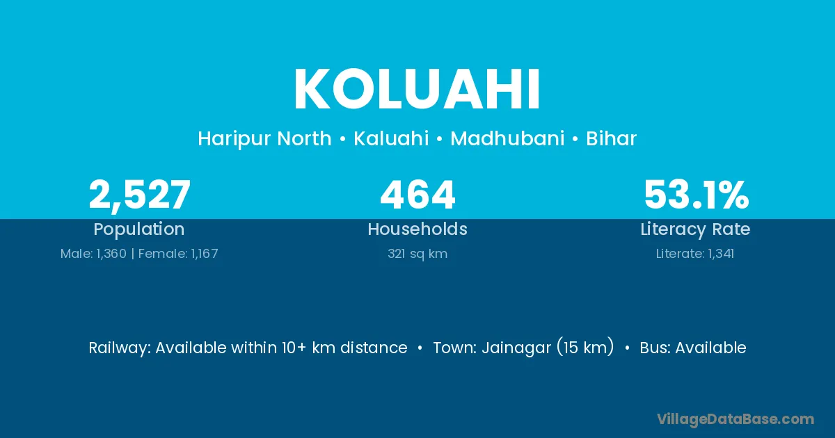 Jainagar (15 km) is the nearest town to Koluahi village for major economic activities and is located approximately 15 km away.