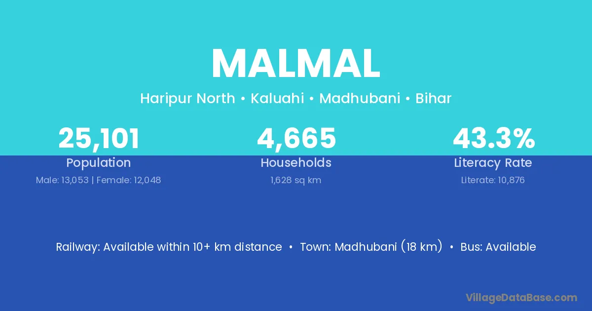 Madhubani (18 km) is the nearest town to Malmal village for major economic activities and is located approximately 18 km away.