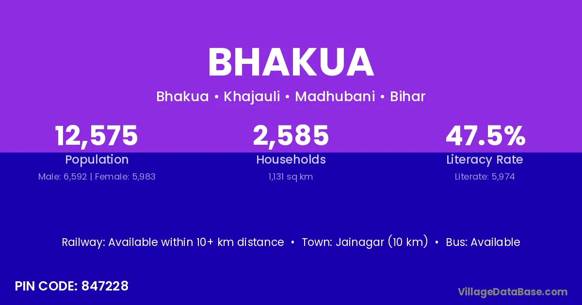 Jainagar (10 km) is the nearest town to Bhakua village for major economic activities and is located approximately 10 km away.