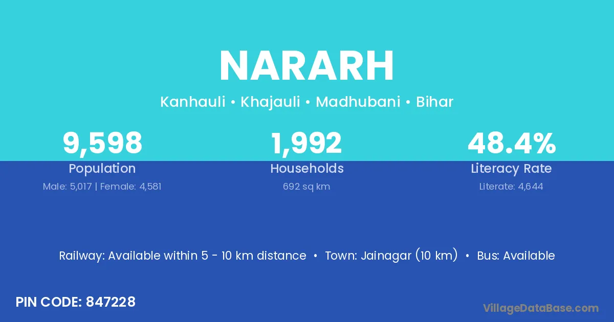 Jainagar (10 km) is the nearest town to Nararh village for major economic activities and is located approximately 10 km away.