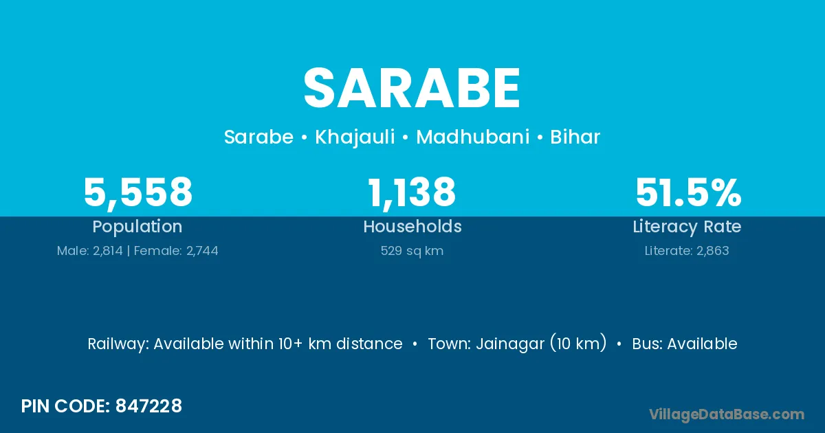 Jainagar (10 km) is the nearest town to Sarabe village for major economic activities and is located approximately 10 km away.