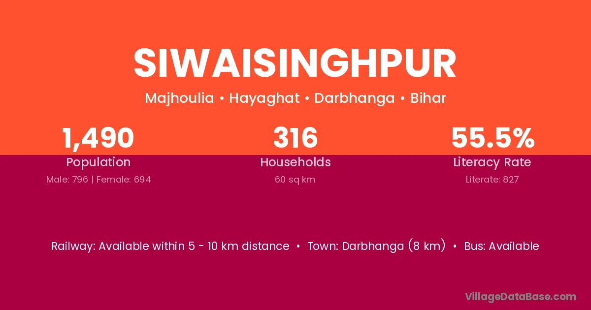 Jhanjharpur (10 km) is the nearest town to Siwaisinghpur village for major economic activities and is located approximately 10 km away.