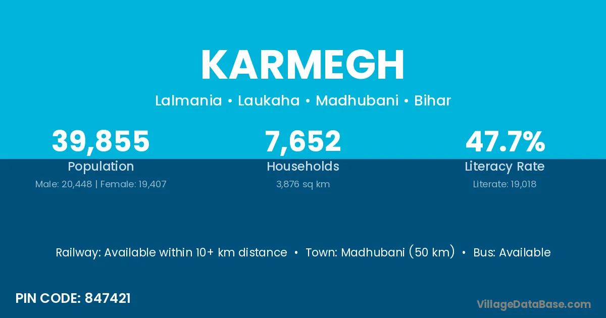Madhubani (50 km) is the nearest town to Karmegh village for major economic activities and is located approximately 50 km away.