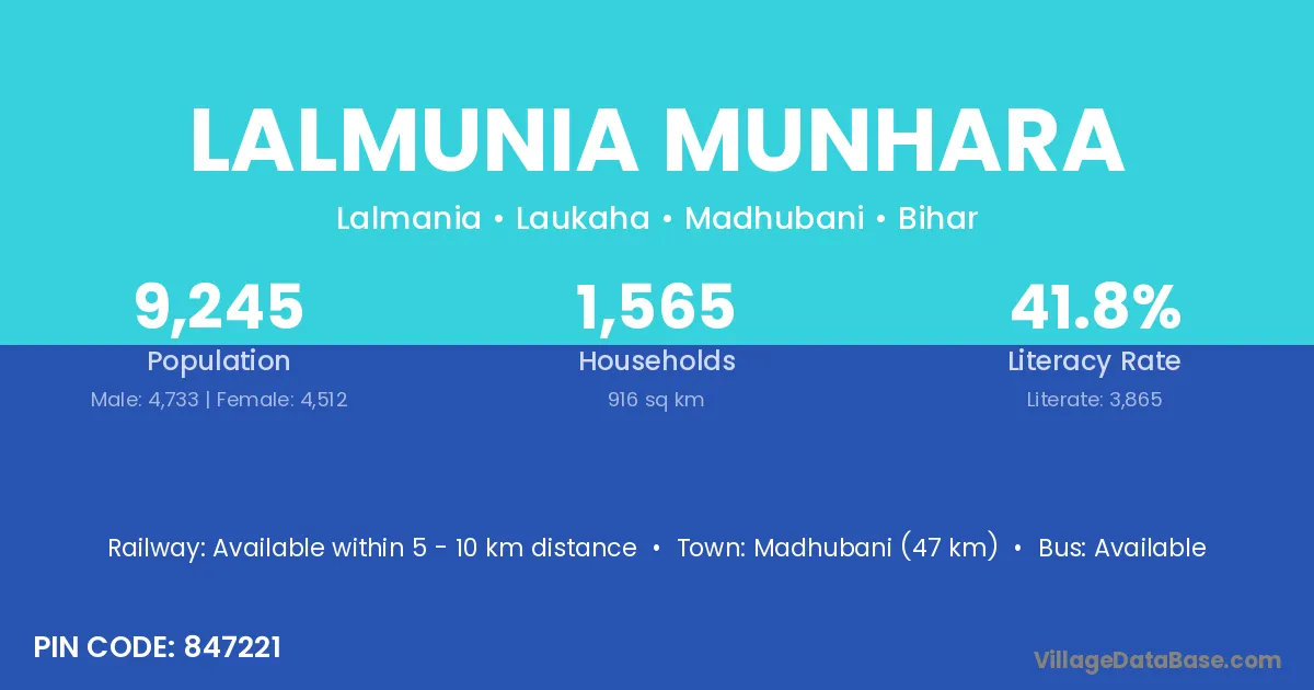 Madhubani (47 km) is the nearest town to Lalmunia Munhara village for major economic activities and is located approximately 47 km away.