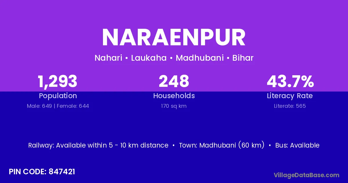 Madhubani (60 km) is the nearest town to Naraenpur village for major economic activities and is located approximately 60 km away.