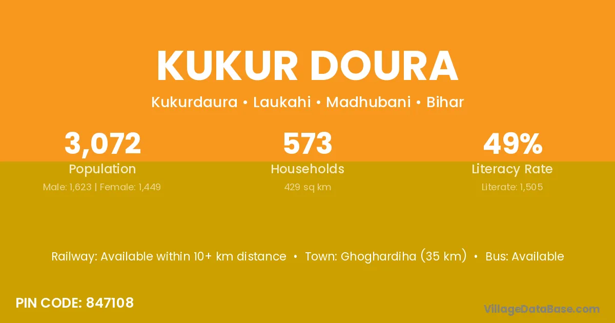 Ghoghardiha (35 km) is the nearest town to Kukur Doura village for major economic activities and is located approximately 35 km away.