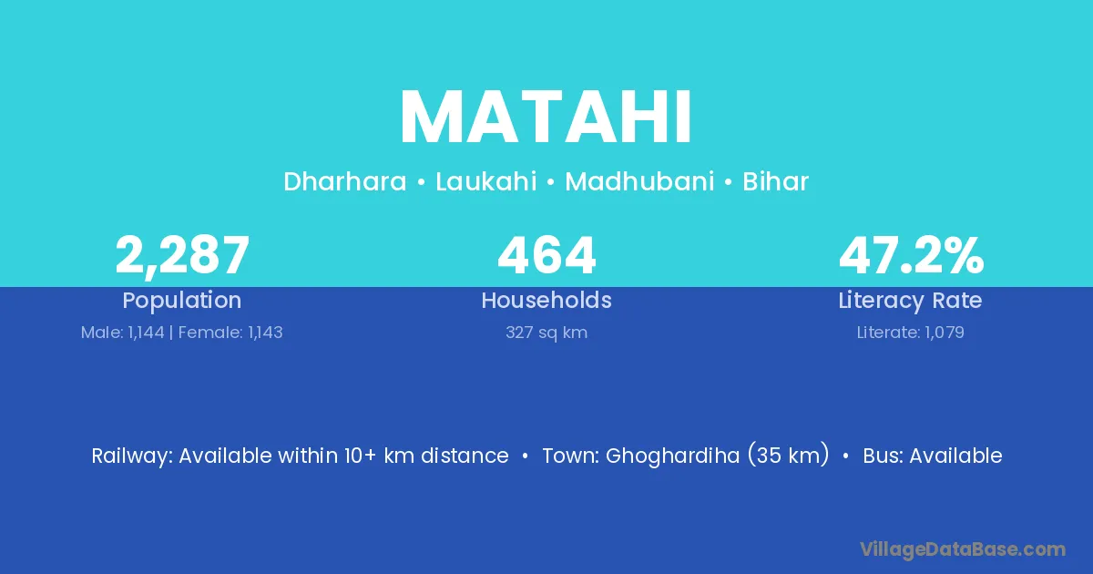 Ghoghardiha (35 km) is the nearest town to Matahi village for major economic activities and is located approximately 35 km away.