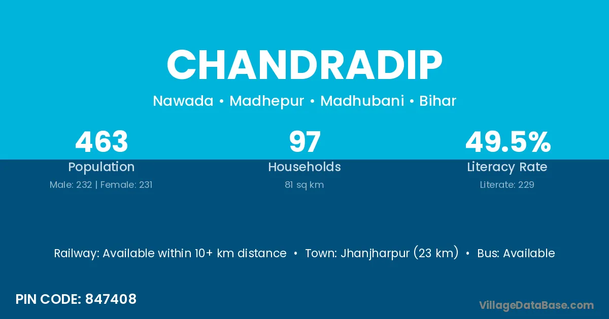 Jhanjharpur (23 km) is the nearest town to Chandradip village for major economic activities and is located approximately 23 km away.