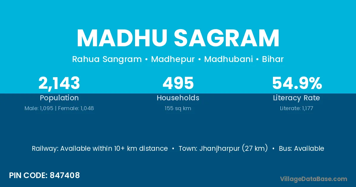 Jhanjharpur (27 km) is the nearest town to Madhu Sagram village for major economic activities and is located approximately 27 km away.