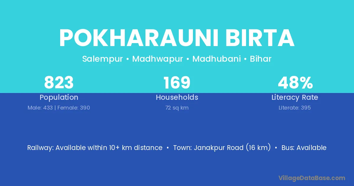 Janakpur Road (16 km) is the nearest town to Pokharauni Birta village for major economic activities and is located approximately 16 km away.