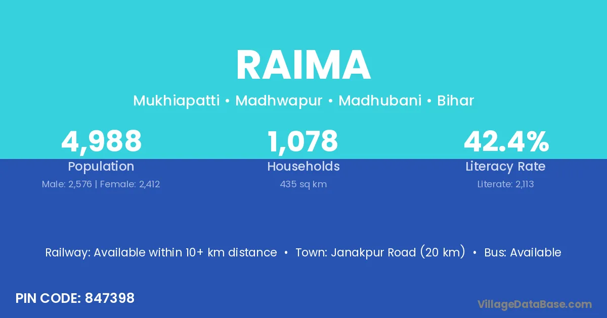 According to Census 2011 information, the village code of Raima village is 847398.