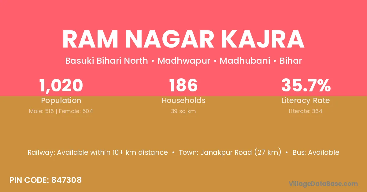 Janakpur Road (27 km) is the nearest town to Ram Nagar Kajra village for major economic activities and is located approximately 27 km away.