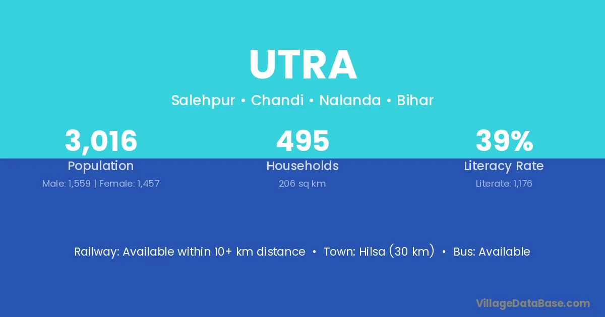 The literacy rate of Utra village is 40.48%. Male literacy stands at 48.39% and female literacy at 32.83%.