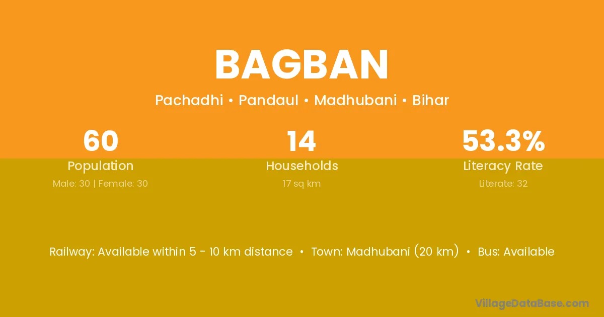Bagban village has a total population of 60 people, of which 30 are males and 30 are females.