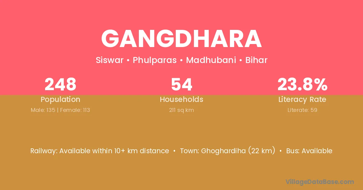 Ghoghardiha (22 km) is the nearest town to Gangdhara village for major economic activities and is located approximately 22 km away.