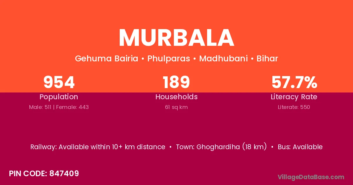 Ghoghardiha (18 km) is the nearest town to Murbala village for major economic activities and is located approximately 18 km away.