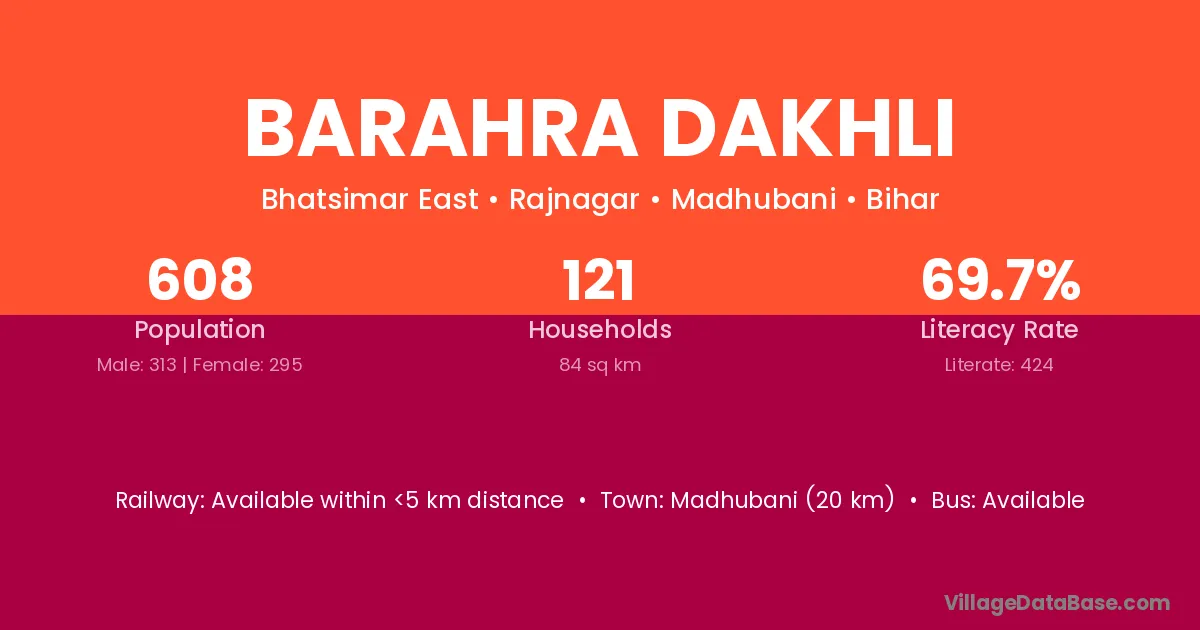 Madhubani (20 km) is the nearest town to Barahra Dakhli village for major economic activities and is located approximately 20 km away.