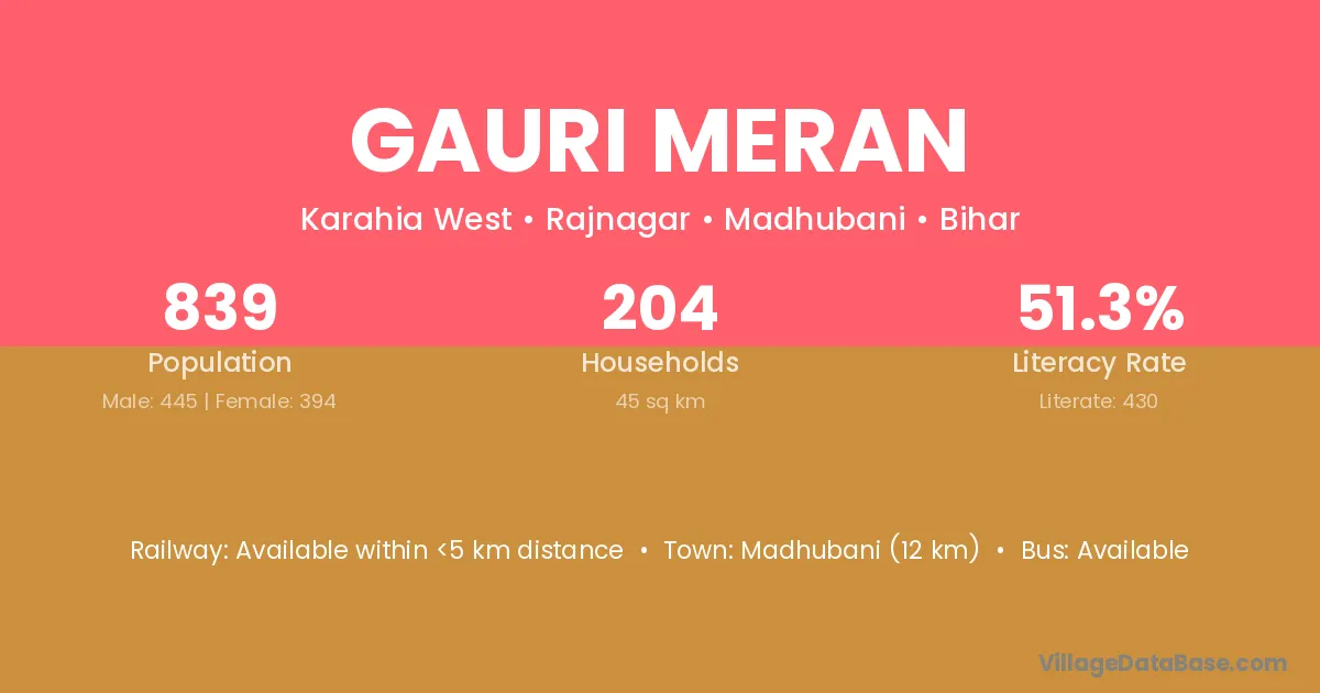 Madhubani (12 km) is the nearest town to Gauri Meran village for major economic activities and is located approximately 12 km away.