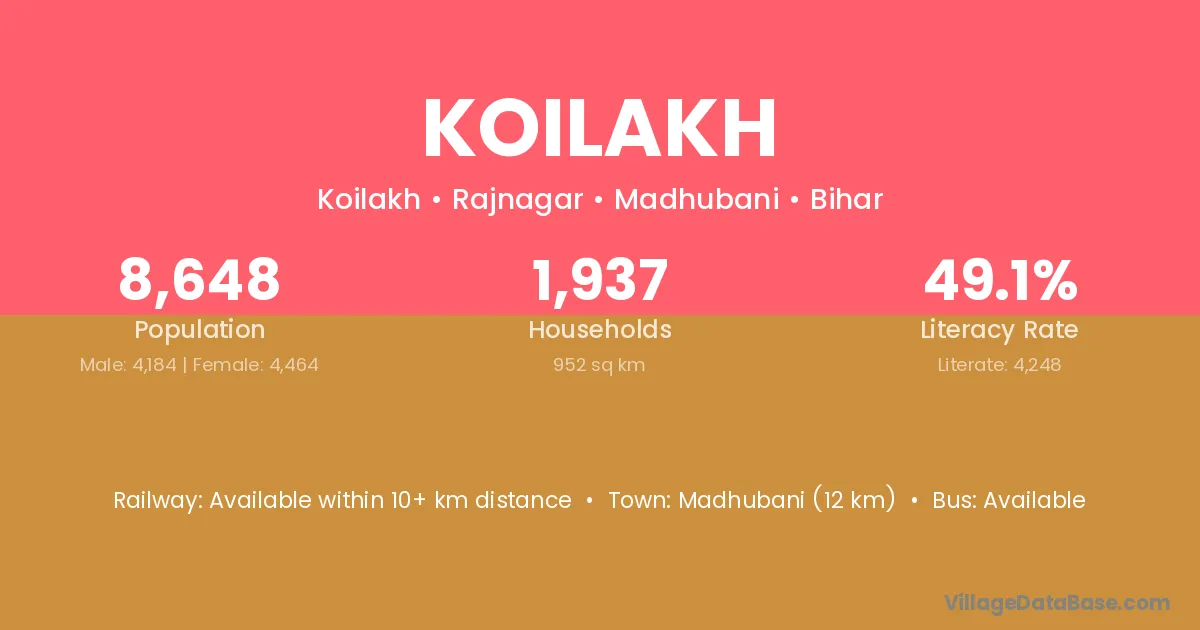 Madhubani (12 km) is the nearest town to Koilakh village for major economic activities and is located approximately 12 km away.