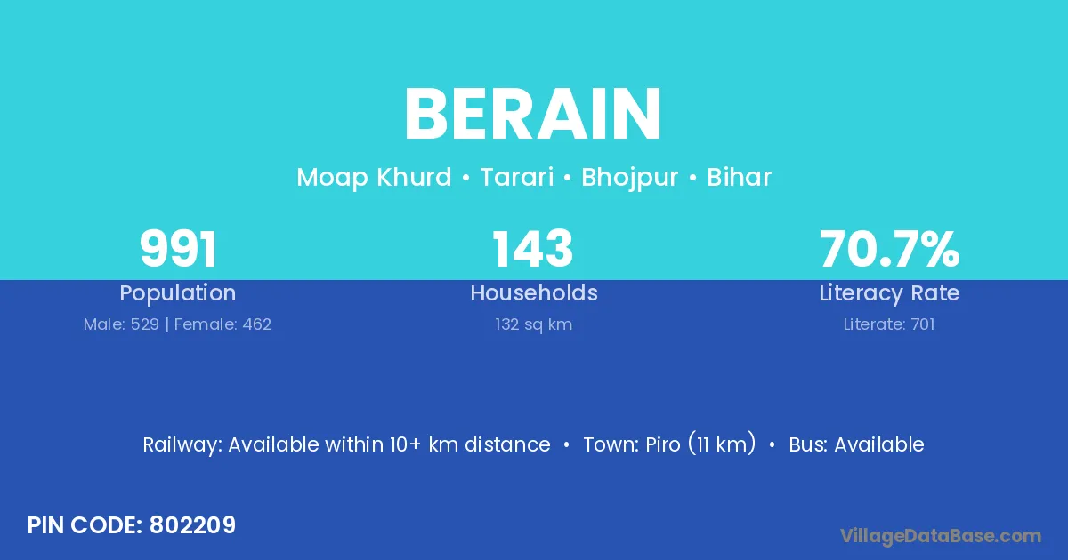 Munger (40 km) is the nearest town to Berain village for major economic activities and is located approximately 40 km away.