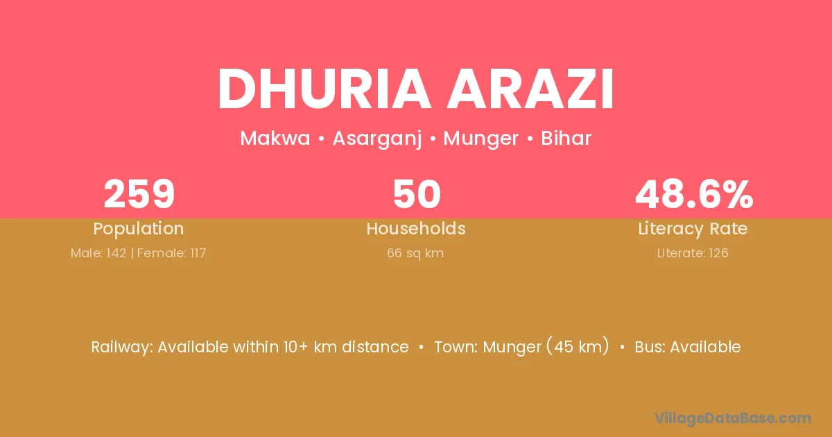 Munger (45 km) is the nearest town to Dhuria Arazi village for major economic activities and is located approximately 45 km away.
