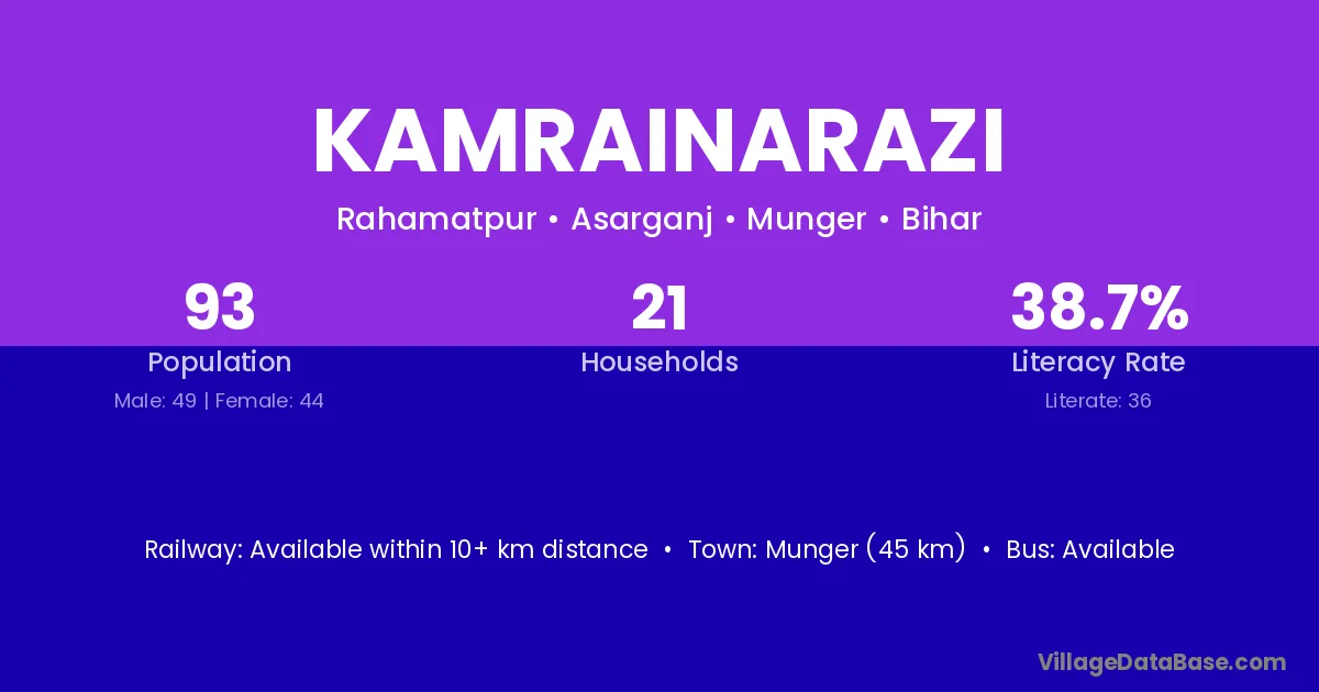 Munger (45 km) is the nearest town to Kamrainarazi village for major economic activities and is located approximately 45 km away.