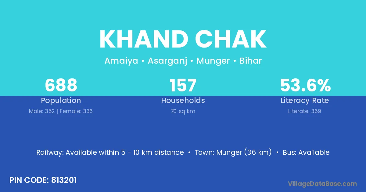 Munger (36 km) is the nearest town to Khand Chak village for major economic activities and is located approximately 36 km away.
