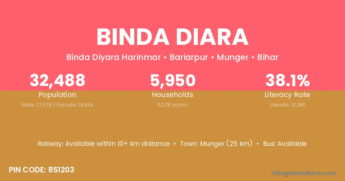 Munger (25 km) is the nearest town to Binda Diara village for major economic activities and is located approximately 25 km away.