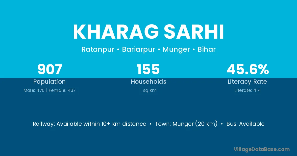 Munger (20 km) is the nearest town to Kharag Sarhi village for major economic activities and is located approximately 20 km away.