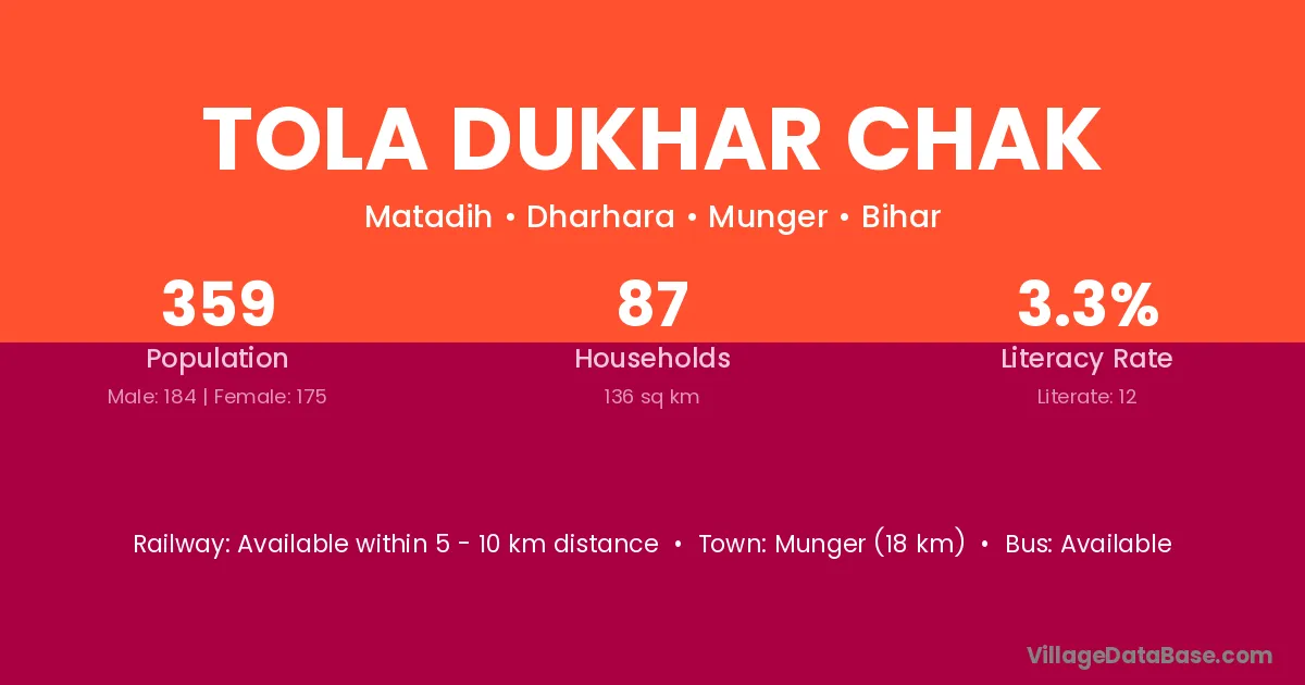 Munger (18 km) is the nearest town to Tola Dukhar Chak village for major economic activities and is located approximately 18 km away.