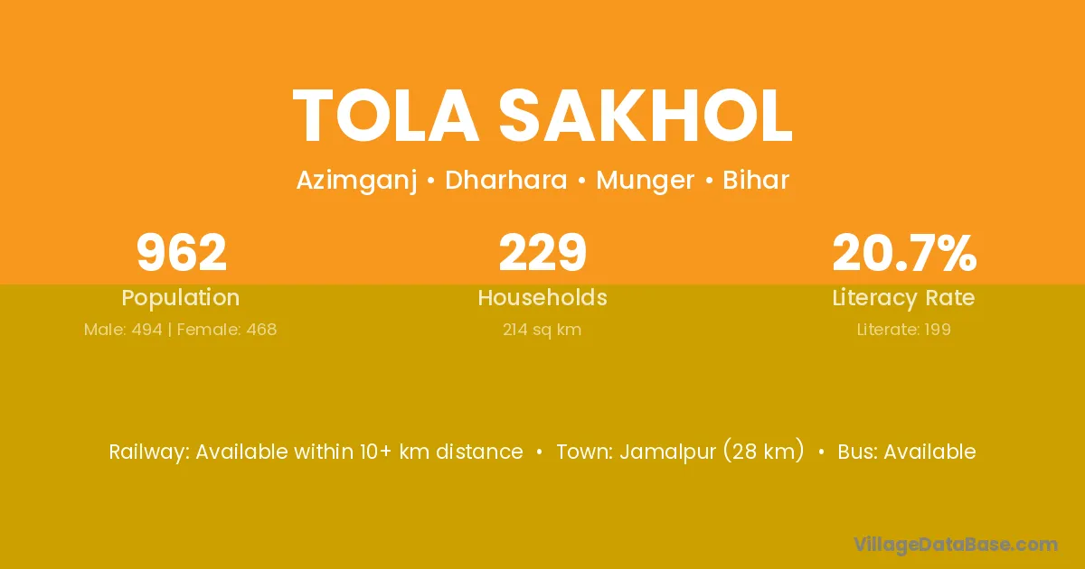 Jamalpur (28 km) is the nearest town to Tola Sakhol village for major economic activities and is located approximately 28 km away.